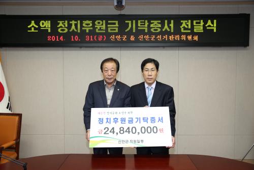 ½Å¾È±º(±º¼ö °í±æÈ£)Àº ±ú²ýÇÑ Á¤Ä¡¹®È ¹ßÀüÀ» À§ÇØ ±º °ø¹«¿ø 271¸íÀÌ Á¤¼º²¯ ¸ðÀº ¼Ò¾× Á¤Ä¡ÈÄ¿ø±Ý 2484¸¸¿øÀ» ½Å¾È±º¼±°Å°ü¸®À§¿øÈ¸¿¡ Àü´ÞÇß´Ù.