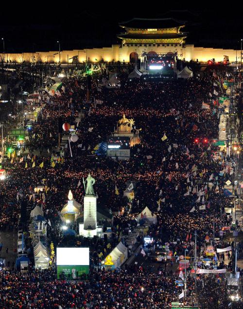 ¹Ú±ÙÇý ´ëÅë·É ÃëÀÓ 4ÁÖ³âÀÎ Áö³ 25ÀÏ ¼¿ï ±¤È¹®±¤ÀåÀ» ºñ·ÔÇØ Àü±¹ °¢Áö¿¡¼ 107¸¸¸íÀÇ ½Ã¹ÎµéÀÌ ÃкÒÀ» µé°í źÇÙ ÀοëÀ» Ã˱¸Çß´Ù. Áö³ÁÖ 84¸¸¸í(Àü±¹±âÁØ)À̾ú´ø ÃкÒÁýȸ ÀÎÆÄ´Â ÇÑ ÁÖ ¸¸¿¡ 23¸¸¸íÀÌ ´Ã¾ú´Ù. ¼¿ï ±¤È¹®±¤Àå¿¡¸¸ 100¸¸¸íÀÌ ¸ô·È´Ù.