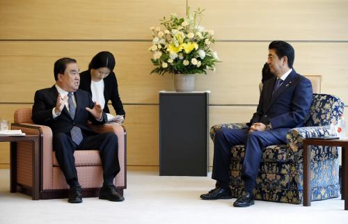 18ÀÏ NHK, ¾Æ»çÈ÷½Å¹®, ´ÏÈ¥°ÔÀÌÀÚÀ̽Ź® µî ÀϺ» ¾ð·Ð¿¡ ÀÇÇϸé À̳¯ ¿ÀÀü µµÄì(ÔÔÌÈ) ÃѸ®°üÀú¿¡¼ ¾à 40ºÐ°£ ÁøÇàµÈ ȸ´ã¿¡¼ ¾Æº£ ÃѸ®´Â ¡°Çѱ¹Àº ÀϺ»¿¡ ÀÖ¾î¼ Àü·«Àû ÀÌÀÍÀ» °øÀ¯ÇÏ´Â °¡Àå Áß¿äÇÑ ÀÌ¿ô±¹°¡¡±¶ó¸é¼ ¡°Çѱ¹ÀÇ »õ Á¤±Ç°ú ¹Ì·¡ÁöÇâÀû ÇÑÀÏ °ü°è¸¦ ±¸ÃàÇÏ°í ½Í´Ù¡±¶ó°í ¸»Çß´Ù.