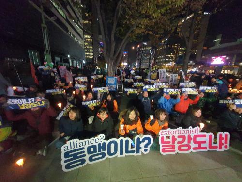 À̺ñ½Ã´Â ¡°¾Æ¹«¸® ¹Ì±¹°úÀÇ µ¿¸ÍÀ» º¸¹°Ã³·³ ¿©±â´õ¶óµµ ¹® ´ëÅë·ÉÀº ÀÌó·³ ±Þ°ÝÇÑ Áõ¾× ¿ä±¸¿¡ ÀÀÇÒ ¼ö ¾ø´Ù¡±°í ÁöÀûÇß´Ù. À̾î Áö³´Þ ¹æÀ§ºñ ºÐ´ã±Ý Çù»ó °á·ÄÀ» °Å·Ð, ¡°¹Ì±¹ ´ëÇ¥´ÜÀº »óó¿¡ ¼Ò±ÝÀ» ¹®Áö¸£±â À§ÇØ Áï¼®¿¡¼ ÀÚ¸®¸¦ ¹ÚÂ÷°í ³ª°¬´Ù¡±°í ºñÆÇÇß´Ù.