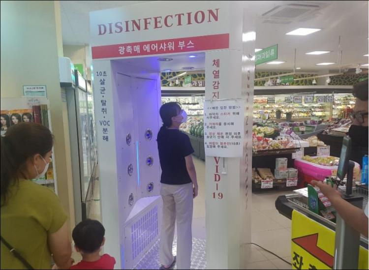 Àü±¹ÀÌ »çȸÀû °Å¸®µÎ±â 2´Ü°è·Î °Ý»óµÈ »óȲ¿¡¼ Áö³ 24ÀÏ ±¤Ã˸Ÿ¦ ÀÌ¿ëÇÑ »ì±ÕÀåÄ¡ ƯÇã±â¼úÀÌ Å¾ÀçµÈ ¹æ¿ªºÎ½º¸¦ »ê¸²¸¶Æ® ³»¿¡ ¼³Ä¡ÇÏ¿© ¸¶Æ®¹æ¹®°´µéÀÌ ¾ÈÀüÇÏ°Ô ¸¶Æ®¸¦ ÀÌ¿ëÇÒ ¼ö ÀÖµµ·Ï ÇÏ°í ¾È¸éÀÎ½Ä Ã¼¿ÂÃøÁ¤±â¸¦ ÀÌ¿ëÇÏ¿© ºñ´ë¸é ü¿ÂÃøÁ¤À» ÇÏ´Â °ÍÀº ¹°·Ð ¸¶½ºÅ© ¹ÌÂø¿ëÀÚµµ ÀÚµ¿ ÀνÄÀÌ µÇ¾î Ȥ½Ã³ª ¹ß»ýÇÒÁö ¸ð¸£´Â °¨¿°¿¡µµ Áï°¢ ´ëÀÀÇÒ ¼ö ÀÖ´Â ½Ã½ºÅÛÀ» ±¸ÃàÇß´Ù.