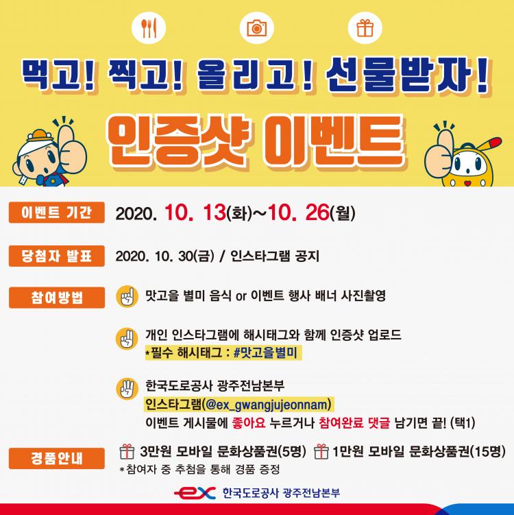 ÀÌ ±â°£ µ¿¾È ¡®¸À°íÀ» º°¹Ì¡¯ À½½Ä »çÁøÀ̳ª ÈÞ°Ô¼Ò¿¡ ¼³Ä¡µÈ À̺¥Æ® Çà»ç ¹è³Ê »çÁøÀ» ÂïÀº ÀÎÁõ¼¦À» °³ÀÎ ÀνºÅ¸±×·¥¿¡ µî·ÏÇÏ°í ¡®Çѱ¹µµ·Î°ø»ç ±¤ÁÖÀü³²º»ºÎ¡¯ ÀνºÅ¸±×·¥ÀÇ À̺¥Æ® Çà»ç °Ô½Ã¹°À» °Ë»öÇÑ ÈÄ¿¡ À̺¥Æ®¿¡ Âü¿©ÇÏ¸é µÈ´Ù.
