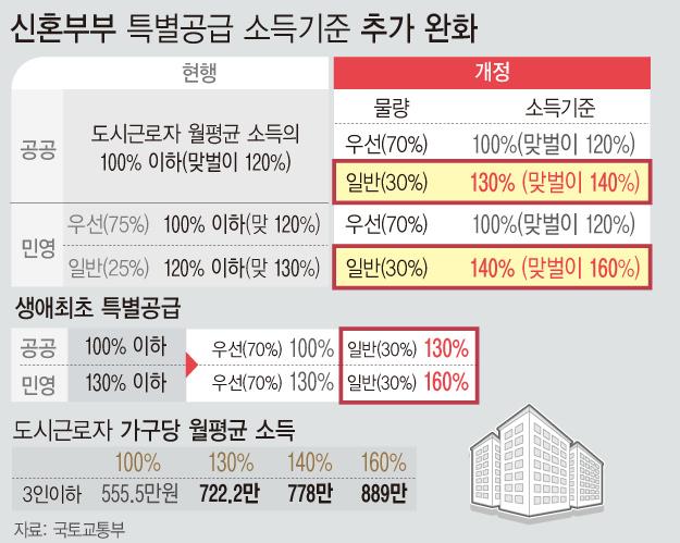 À̹ø °³Á¤¾È¿¡´Â ½ÅÈ¥ºÎºÎ Ưº°°ø±Þ ¼Òµæ±âÁØÀ» ¹Î¿µÁÖÅÃÀÇ °æ¿ì µµ½Ã±Ù·ÎÀÚ ¿ùÆò±Õ ¼Òµæ 140%(¸Â¹úÀÌ 160%) ÀÌÇÏ·Î ¿ÏÈÇÏ´Â ³»¿ëÀÌ ´ã°å´Ù.