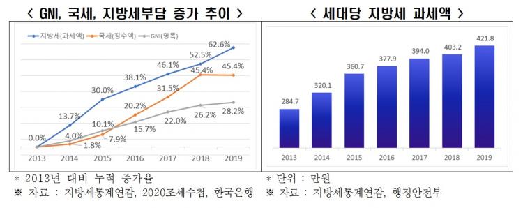°°Àº ±â°£ GNI(±¹¹ÎÃѼҵæ)´Â 28.2%, ±¹¼¼ ¡¼ö¾×Àº 45.4% Áõ°¡ÇØ Áö¹æ¼¼ ºÎ´ãÀÌ GNI ´ëºñ 2.2¹è, ±¹¼¼Â¡¼ö¾× ´ëºñ 1.3¹è ÀÌ»ó ºü¸£°Ô Áõ°¡Çß´Ù. ±× °á°ú, 2013³â 284¸¸7000¿øÀÌ´ø ¼¼´ë´ç Áö¹æ¼¼ °ú¼¼¾×Àº Áö³ÇØ 421¸¸8000¿øÀ¸·Î 1.5¹è Áõ°¡Çß´Ù.