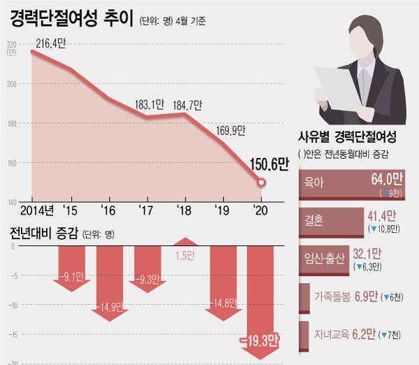 ÇÑÆí, 15~54¼¼ ±âÈ¥¿©¼º Áß Ãë¾÷ÀÚ(515¸¸8000¸í)ÀÇ °æ·Â´ÜÀý °æÇèÀ» »ìÆìº¸¸é °áÈ¥, Àӽš¤Ãâ»ê, À°¾Æ, Àڳ౳À°, °¡Á·µ¹º½ ¶§¹®¿¡ Á÷ÀåÀ» ±×¸¸µÐ ÀûÀÌ ÀÖ´Â °æÇèÀÚ´Â 214¸¸1000¸íÀ¸·Î Àü³âº¸´Ù 7¸¸3000¸í(-3.3%) °¨¼ÒÇß´Ù.