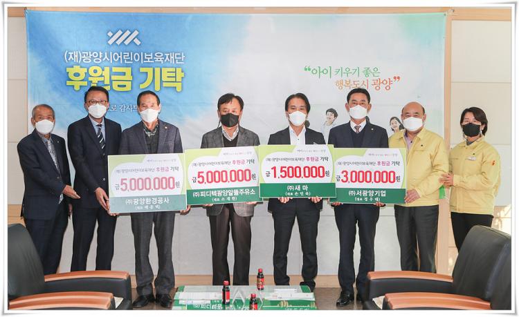 À̳¯ ±âŹ½Ä¿¡´Â ¢ß»õ¸¶(´ëÇ¥ ¼Õ¹Î¿í) 1¹é5½Ê¸¸ ¿ø, ¢ß±¤¾çȯ°æ°ø»ç(´ëÇ¥ ¹èÁ¾ÅÃ) 5¹é¸¸ ¿ø, ¢ß¼±¤¾ç±â¾÷(´ëÇ¥ Á¤¿ìÅÂ) 3¹é¸¸ ¿ø, ¢ßÇǵðÅØ±¤¾ç¾Ë¶ãÁÖÀ¯¼Ò(´ëÇ¥ ¼ÒÀçÇÑ) 5¹é¸¸ ¿øÀ» ±âŹÇß´Ù. ¢ß»õ¸¶´Â 4Â÷»ê¾÷ °ü·Ã ÀÚµ¿È½Ã½ºÅÛ Á¶Á¤ÀåÄ¡¸¦ Á¦Á¶ÇÏ´Â ±â¾÷À¸·Î ¿ì¸® Áö¿ªÀÇ ¾ÆÀ̵éÀÌ ÇØ¸¼Àº ¿ôÀ½À¸·Î Èñ¸ÁÂù ¹Ì·¡¸¦ ¿ ¼ö ÀÖµµ·Ï µµ¿òÀ» ÁÖ°íÀÚ ÈÄ¿ø±ÝÀ» Àü´ÞÇϰí, ¢ß±¤¾çȯ°æ°ø»ç´Â 1997³â ¼³¸³µÅ ±¤¾çÁö¿ª Æó±â¹°À» ó¸®ÇÏ´Â ±â¾÷À¸·Î ¾ÆÀÌ Å°¿ì±â ÁÁÀº Çູ µµ½Ã ¸¸µé±â¿¡ ÈûÀ» º¸Å°íÀÚ Á÷¿øµé°ú ¶æÀ» ¸ð¾Æ ÈÄ¿øÇÏ°Ô µÇ¾ú´Ù°í ¹àÇû´Ù.