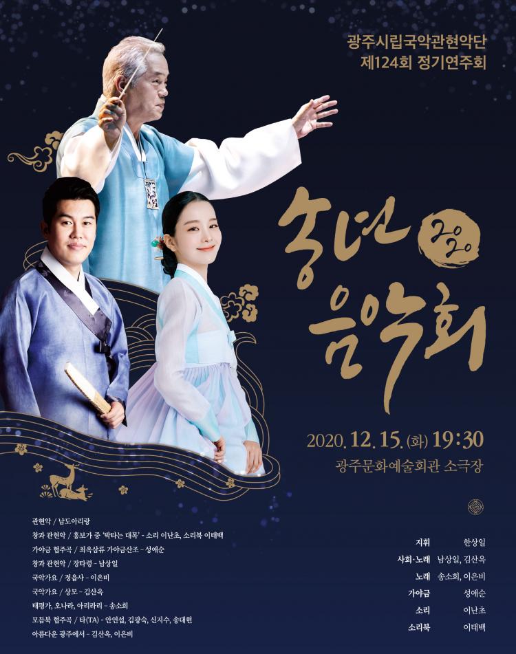 ±¤Áֽø³±¹¾Ç°üÇö¾Ç´ÜÀº ¿À´Â 15ÀÏ ¿ÀÈÄ 7½Ã30ºÐ ±¤ÁÖ¹®È¿¹¼úȸ°ü ¼Ò±ØÀå¿¡¼ Á¦124ȸ Á¤±â¿¬ÁÖȸ 2020¼Û³âÀ½¾Çȸ¸¦ ¼±º¸Àδٰí 13ÀÏ ¹àÇû´Ù. À½¾Çȸ´Â »óÀÓÁöÈÖÀÚ ÇÑ»óÀÏÀÌ ÁöÈÖºÀÀ» Àâ°í ±¹¾Ç½ºÅ¸ ¼Û¼ÒÈñ¿Í °¡¾ß±Ý ¿¬ÁÖÀÚ ¼º¾Ö¼ø µîÀÌ Çù¿¬ÇÑ´Ù.
