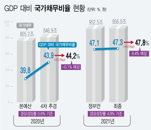 ÇÏÁö¸¸ »õ·Ó°Ô Á¦½ÃÇÑ °æ»ó¼ºÀå·ü 4.4%¸¦ ´ëÀÔÇϸé GDP ´ëºñ ±¹°¡Ã¤¹«ºñÀ²Àº 47.8%·Î ´õ ³ô¾ÆÁø´Ù. Á¤ºÎ´Â À̹ø Àü¸Á¿¡¼ 2021³â °æÁ¦¼ºÀå·üÀÌ 3.2%, °æ»ó¼ºÀå·üÀÌ 4.4%¸¦ ±â·ÏÇÒ °ÍÀ¸·Î ¿¹ÃøÇß´Ù. ¸¸¾à ³»³â¿¡µµ Äڷγª19 È®»ê¼¼°¡ ÁøÁ¤µÇÁö ¾Ê¾Æ ¼ºÀå·üÀÌ Á¤ºÎ ¿¹»óº¸´Ù ³·¾ÆÁö°Ô µÇ¸é ³ª¶ùºúÀÌ ½×ÀÌ´Â ¼Óµµ´Â ´õ¿í´õ »¡¶óÁú °¡´É¼ºµµ Å©´Ù.