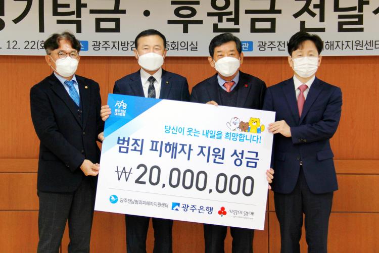 À̹ø ¼º±Ý Àü´Þ½Ä¿¡´Â °íº´ÀÏ ±¤ÁÖÀºÇà ºÎÇàÀå°ú ¿©È¯¼· ±¤ÁÖÁö¹æ°ËÂûû °Ë»çÀå, ÀÌÀº¿ ±¤ÁÖÀü³²¹üÁËÇÇÇØÀÚÁö¿ø¼¾ÅÍ ÀÌ»çÀå, ÇÑ»ó¿ø ±¤ÁÖ»çȸº¹Áö°øµ¿¸ð±ÝȸÀå ¹× °ü°èÀÚ µîÀÌ Âü¼®ÇßÀ¸¸ç, Àü´ÞµÈ ¼º±ÝÀº ±¤ÁÖ»çȸº¹Áö°øµ¿¸ð±Ýȸ¸¦ ÅëÇØ ±¤ÁÖ¡¤Àü³² Áö¿ªÀÇ ¹üÁË ÇÇÇØÀÚ¸¦ À§ÇÑ ÈÄ¿ø±ÝÀ¸·Î »ç¿ëµÉ ¿¹Á¤ÀÌ´Ù.