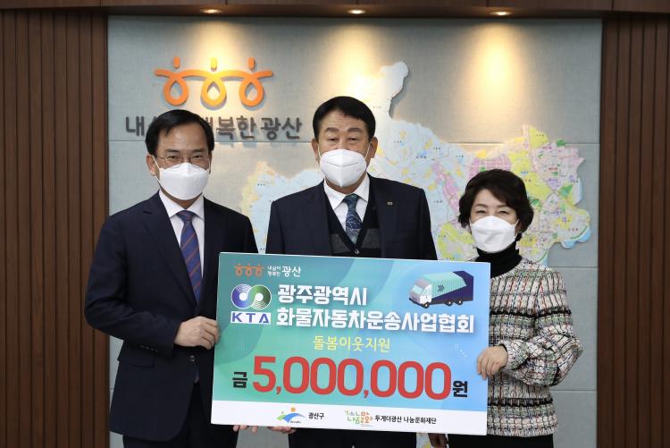 ±¤ÁÖ½Ãȹ°ÀÚµ¿Â÷¿î¼Û»ç¾÷Çùȸ(ÀÌ»çÀå ÃÖ¹«Áø)°¡ 21ÀÏ ±¤»ê¾îµîÁö¿ªÀÚȰ¼¾ÅÍ¿¡ ¼º±Ý 500¸¸¿øÀ» ±âºÎÇß´Ù. ÃÖ¹«Áø ÀÌ»çÀåÀº ¡°°¡Áø °ÍÀ» Á¶±Ý¾¿ ³ª´©´Â ºÐÀ§±â ¼Ó¿¡¼ ÀÌ¿ôµéÀÌ ±àÁ¤ÀÇ ÈûÀ» ¾òÀ¸¸é ÁÁ°Ú´Ù¡±¸ç ¡°Äڷγª19·Î Èûµé¾îÇÏ´Â ÀÌ¿ô¿¡°Ô Èñ¸ÁÀÇ µðµõµ¹ÀÌ µÇ·Á°í ³ª´®¿¡ ³ª¼¹´Ù¡±°í ¸»Çß´Ù.