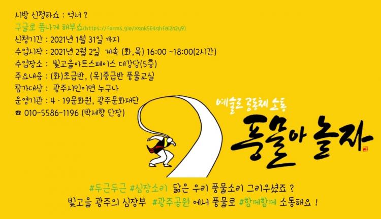 ¿ÃÇØÀÇ Ã¹ Ȱµ¿Àº 4¡¤19¹®È¿ø(¿øÀå ±è±âÀÏ), ±¤ÁÖ¹®ÈÀç´Ü(´ëÇ¥ Ȳdz³â)°¡ °øµ¿ ÁÖÃÖÇÏ´Â ¡®¿¹¼ú·Î °øµ¿Ã¼ ¼ÒÅë-dz¹°¾Æ ³îÀÚ¡¯ ¿¹¼ú±³½Ç ¿î¿µÀÌ´Ù. ±¤ÁÖÀÇ ½ÉÀåºÎÀÎ ±¤ÁÖ°ø¿ø¿¡¼ ½ÉÀå ¶Ù´Â ¼Ò¸®¿Í ´àÀº dz¹°À» ÅëÇØ ¼ÒÅëÀ» ÇØº¸ÀÚ´Â ÇÁ·Î±×·¥ÀÌ´Ù. ¿À´Â 31ÀϱîÁö ¿Â¶óÀÎÀ» ÅëÇØ ½Åû Á¢¼ö(https://bit.ly/3bYxgUU) Çϰí, ù ¼ö¾÷Àº 2¿ù 2ÀϺÎÅÍ (È, ¸ñ) 16:00 ~ 18:00(2½Ã°£) ÁøÇàµÈ´Ù. È¿äÀÏÀº Ãʱ޹Ý, ¸ñ¿äÀÏÀº Áß±Þ¹ÝÀ¸·Î ¹«·á ¿î¿µµÈ´Ù.