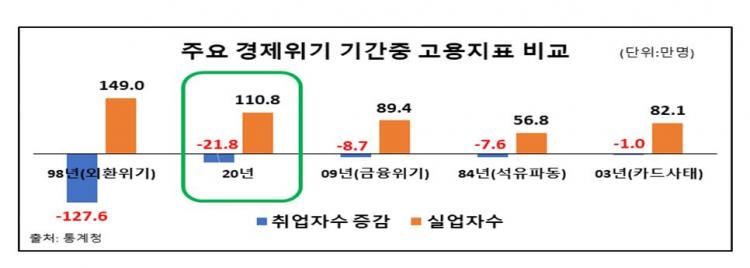 2020³â ÁÖ¿ä °í¿ëÁöÇ¥´Â 1998³â ¿ÜȯÀ§±â ÀÌÈÄ ¿ª´ë 2¹øÂ°·Î ¾Çȵƴø °ÍÀ¸·Î ³ªÅ¸³µ´Ù. Áö³ÇØ °æÁ¦È°µ¿Àα¸´Â 2801.2¸¸¸íÀ¸·Î Àü³â ´ëºñ 17.4¸¸¸í °¨¼ÒÇߴµ¥, ÀÌ °°Àº °¨¼ÒÆøÀº 1998³â(35.4¸¸¸í¡é)¿¡ ÀÌ¾î µÎ ¹øÂ°´Ù. 15¼¼ ÀÌ»ó Àα¸°¡ 28.1¸¸¸í Áõ°¡ÇßÀ½¿¡µµ ºÒ±¸ÇÏ°í °æ±âħü·Î ºñ°æÁ¦È°µ¿Àα¸°¡ 45.5¸¸¸íÀ̳ª Áõ°¡ÇÑ ¿µÇâÀÌ´Ù.