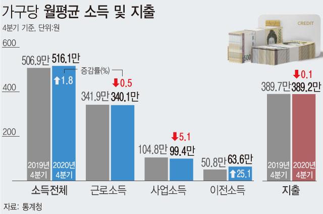 Åë°èûÀÌ 18ÀÏ ¹ßÇ¥ÇÑ ¡®2020³â 4ºÐ±â °¡°èµ¿ÇâÁ¶»ç¡¯¿¡ µû¸£¸é Àü±¹ °¡±¸(2ÀÎ ÀÌ»ó)´ç ¿ùÆò±Õ ¼ÒµæÀº 516¸¸1000¿øÀ¸·Î Àü³â µ¿±â ´ëºñ 1.8% Áõ°¡Çß´Ù. ¹°°¡ º¯µ¿ºÐÀ» Á¦¿ÜÇÑ ½ÇÁú¼ÒµæÀº Áö³ÇØ °°Àº ±â°£º¸´Ù 1.4% ´Ã¾ú´Ù.
