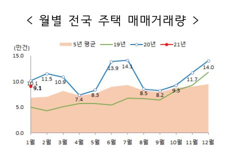 21ÀÏ ±¹Åä±³ÅëºÎ°¡ ¹ßÇ¥ÇÑ 1¿ù Àü±¹ ÁÖÅà ¸Å¸Å°Å·¡·®Àº 9¸¸679°ÇÀ¸·Î Àü¿ù 14¸¸281°Ç ´ëºñ 35.4% °¨¼ÒÇß´Ù. Àü³âµ¿¿ù¿¡ ºñÇØ¼´Â 10.5% °¨¼ÒÇÑ °ÍÀ̰í, 5³â Æò±Õ¿¡ ºñÇØ¼´Â 32.2% Áõ°¡ÇÑ °ÍÀÌ´Ù.