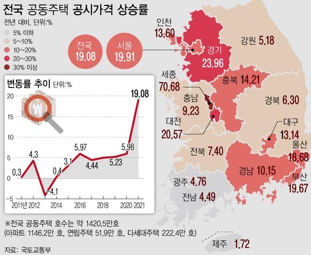 ¿ÃÇØ Àü±¹ ¾ÆÆÄÆ® µî °øµ¿ÁÖÅà Æò±Õ °ø½Ã°¡°ÝÀÌ Àü³â ´ëºñ 19.08% ±ÞµîÇß´Ù. ÀÌ´Â Áö³ÇØ »ó½Â·ü(5.98%)º¸´Ù 3¹è ³Ñ°Ô ¿À¸¥ ¼öÄ¡´Ù. Áö¿ªº°·Î ¼¿ïÀÇ »ó½Â·üÀÌ 19.91%·Î ³ªÅ¸³µ°í, °æ±âµµ´Â ÀÌ º¸´Ù ³ôÀº 23.96%·Î ³ªÅ¸³µ´Ù. ƯÈ÷ Áö³ÇØ Áý°ª »ó½Â·ü 1À§ Áö¿ªÀÎ ¼¼Á¾ »ó½Â·üÀº ¹«·Á 70.68%·Î ³ªÅ¸³ª ¼¼(áª) ºÎ´ãÀÌ ´Ã¾î Å©°Ô ´Ã¾î³¯ °ÍÀ¸·Î º¸ÀδÙ.