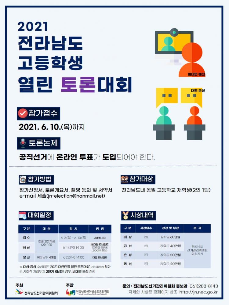 Àü¶ó³²µµ¼±°Å¹æ¼ÛÅä·ÐÀ§¿øÈ¸´Â µµ³» °íµîÇб³ ÀçÇлýÀ» ´ë»óÀ¸·Î ¡¸2021³â Àü¶ó³²µµ °íµîÇлý ¿¸° Åä·Ð´ëȸ¡¹¸¦ °³ÃÖÇÑ´Ù°í ¹àÇû´Ù.