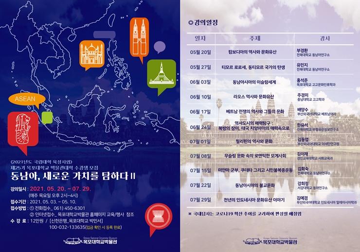 °ÀÇ ÀÏÁ¤Àº ¿À´Â 5¿ù 20ÀÏ(¸ñ)ºÎÅÍ 7¿ù 29ÀÏ(¸ñ)±îÁö ¸ÅÁÖ ¸ñ¿äÀÏ ¿ÀÈÄ 2½ÃºÎÅÍ 4½Ã±îÁöÀ̸ç, ¹Ú¹°°ü ´ë°´ç¿¡¼ ÁøÇàµÈ´Ù. °ÀÇÁÖÁ¦´Â Áö³ Çб⿡ ÀÌ¾î ¡°µ¿³²¾Æ, »õ·Î¿î °¡Ä¡¸¦ ŽÇÏ´Ù¥±¡±·Î ±âȹµÆ´Ù. µ¿³²¾Æ½Ã¾Æ´Â µ¿Æ¼¸ð¸£¸¦ Á¦¿ÜÇÑ ¸ðµç ±¹°¡°¡ 1967³â â¼³µÈ µ¿³²¾Æ½Ã¾Æ ±¹°¡¿¬ÇÕ(Association of Southeast Asian Nations, ASEAN)À» ±¸¼ºÇϰí ÀÖÀ¸¸ç, ¿ì¸®³ª¶ó¿Íµµ 1989³âºÎÅÍ ±ä¹ÐÇÏ°í Æ÷°ýÀûÀÎ °ü°è¸¦ ¸Î¾î¿À°í ÀÖ´Ù. ÃÖ±Ù¿¡´Â ½Å³²¹æÁ¤Ã¥ÀÇ ÁÖ¿ä ÆÄÆ®³Ê·Î ¹ßÀüÇÏ¿© ¿©·¯ ¹æ¸é¿¡¼ Ȱ¹ßÇÑ ±³·ù°¡ À̾îÁö°í ÀÖ´Ù.