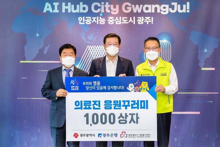 ±¤ÁÖÀºÇàÀº ¾Ë·Î¿¡¹Ì½ºÆ®¿Í ºÎä µî ¿©¸§¿ëǰ°ú È«»ï, Àüº¹Á× µî °Ç°½Äǰ 17Á¾ÀÌ ´ã±ä ÀÀ¿ø²Ù·¯¹Ì 1000°³(5000¸¸ ¿ø »ó´ç)¸¦ ±¤ÁÖ½ÃÀÚ¿øºÀ»ç¼¾ÅÍ¿¡ ±âºÎÇß´Ù.