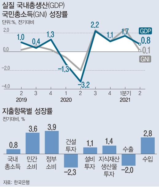 ¾Õ¼ ÇÑÀºÀº ¡®2021³â 2ºÐ±â ±¹¹Î¼Òµæ(ÀáÁ¤)¡¯¿¡¼ ¿ÃÇØ 2ºÐ±â ½ÇÁú ±¹³»ÃÑ»ý»ê(GDP) ¼ºÀå·üÀÌ 0.8%·Î Áý°èµÆ´Ù°í ¹ßÇ¥Çß´Ù. Áö³ 7¿ù 27ÀÏ °ø°³µÈ ¼Óº¸Ä¡(0.7%)º¸´Ù 0.1%Æ÷ÀÎÆ®(p) »óÇâ Á¶Á¤µÆ´Ù.