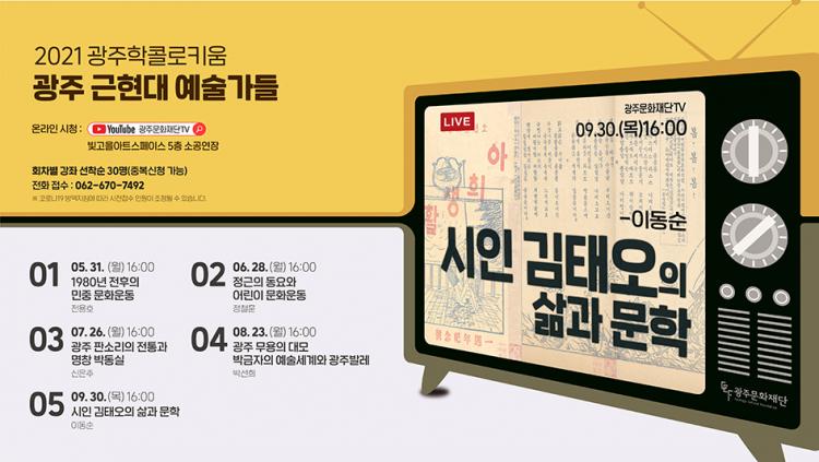 ±¤ÁÖ¹®ÈÀç´ÜÀº ¡®±ÙÇö´ë ±¤ÁÖ ¿¹¼ú°¡µé¡¯À̶ó´Â Å׸¶·Î ´Ù¼¸ Â÷·Ê °³ÃֵǴ 2021 ±¤ÁÖÇÐ ÄÝ·ÎŰ¿ò Áß¿¡¼ ¸¶Áö¸· ¼ø¼·Î ¡®½ÃÀÎ ±èÅ¿ÀÀÇ »î°ú ¹®ÇС¯À» ÁøÇàÇÑ´Ù.