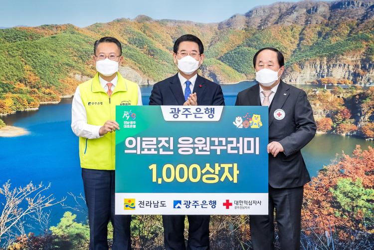 ±¤ÁÖÀºÇà(ÀºÇàÀå ¼ÛÁ¾¿í)Àº Áö³ 26ÀÏ, Àü¶ó³²µµÃ»¿¡¼ ±è¿µ·Ï Àü¶ó³²µµÁö»ç¿Í ¼ÛÁ¾¿í ±¤ÁÖÀºÇàÀå µîÀÌ Âü¼®ÇÑ °¡¿îµ¥ Äڷγª19 ÀÇ·áÁø¿¡°Ô Àü´ÞÇϱâ À§ÇÑ 5õ¸¸¿ø »ó´çÀÇ ¡®ÀÀ¿ø²Ù·¯¹Ì¡¯1000»óÀÚ¸¦ Àü´ÞÇß´Ù°í ¹àÇû´Ù.