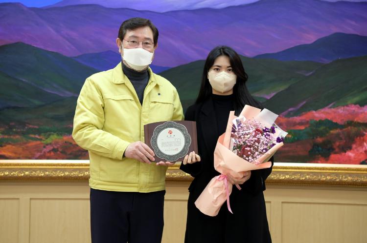 ±¤Áֽô 7ÀÏ ¿ÀÀü ½Ãû ´ëȸÀǽǿ¡¼ 8¹øÂ° ÀÇ·Î¿î ½Ã¹ÎÀ¸·Î ¼±Á¤µÈ ±èÃÊ¿ø(26)¾¾¿¡°Ô ǥâÆÐ¸¦ ¼ö¿©ÇÏ°í °¨»çÀÇ ¸¶À½À» ÀüÇß´Ù.