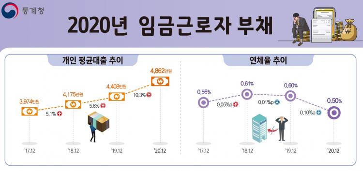 Åë°èûÀÌ 29ÀÏ ¹ßÇ¥ÇÑ ¡®2020³â ÀÏÀÚ¸®ÇàÁ¤Åë°è ÀӱݱٷÎÀÚ ºÎ䡯¸¦ º¸¸é 2020³â ¸» ±âÁØÀ¸·Î ÀӱݱٷÎÀÚÀÇ Æò±Õ ´ëÃâÀº 4862¸¸¿øÀ¸·Î Àü³â(4408)º¸´Ù 10.3%(454¸¸¿ø) Áõ°¡Çß´Ù.