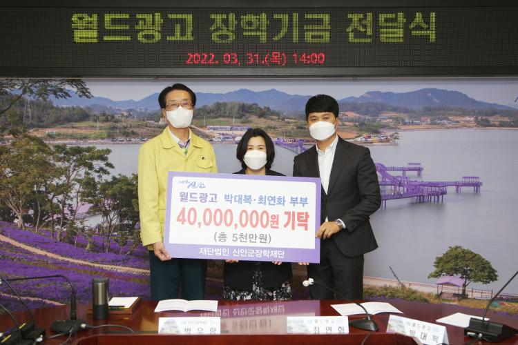 ¿ùµå±¤°í ¹Ú´ëº¹¡¤ÃÖ¿¬È ºÎºÎ´Â Áö³´Þ 31ÀÏ ½Å¾È±ºÃ»À» ¹æ¹®ÇØ ¾î·Á¿î ȯ°æ¿¡¼ Çо÷¿¡ Á¤ÁøÇÏ´Â ÇлýµéÀ» À§ÇØ »ç¿ëÇØ ´Þ¶ó¸ç ½Å¾È±ºÀåÇÐÀç´Ü¿¡ 4000¸¸¿øÀÇ ÀåÇбâ±ÝÀ» ¾àÁ¤Çß´Ù.