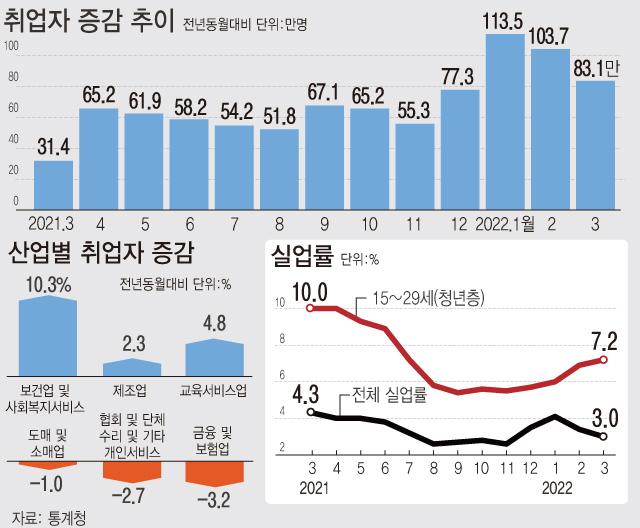 Åë°èûÀÌ 13ÀÏ ¹ßÇ¥ÇÑ ¡®2022³â 3¿ù °í¿ëµ¿Ç⡯¿¡ µû¸£¸é Áö³´Þ Ãë¾÷ÀÚ ¼ö´Â 2775¸¸4000¸íÀ¸·Î 1³â Àüº¸´Ù 83¸¸1000¸í(3.1%) ´Ã¾î 1³â 1°³¿ù° ¿À¸§¼¼¸¦ À¯ÁöÇß´Ù. µ¿¿ù ±âÁØÀ¸·Î º¸¸é 2002³â(86¸¸4000¸í) ÀÌÈÄ ÃÖ´ë Áõ°¡Áö¸¸, Àü¿ù(103¸¸7000¸í)º¸´Ù´Â Áõ°¡ ÆøÀÌ Ãà¼ÒµÆ´Ù.
