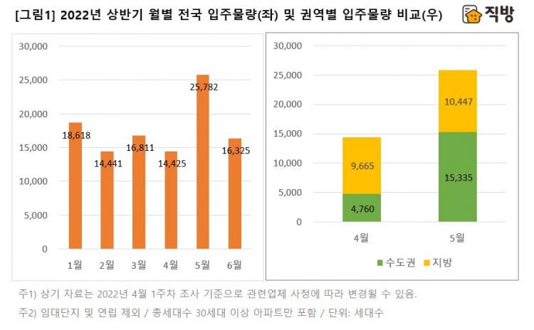 ¼öµµ±ÇÀº Àü¿ù ´ëºñ 3¹è ÀÌ»ó ¸¹Àº 1¸¸5335°¡±¸°¡ ÀÔÁÖÇϰí, Áö¹æÀº Àü¿ùº¸´Ù 8% ´Ã¾î³ 1¸¸447°¡±¸°¡ ÀÔÁÖ¸¦ ½ÃÀÛÇÒ ¿¹Á¤ÀÌ´Ù. Àü±¹ ÃÑ 31°³ ´ÜÁö·Î ¼öµµ±Ç 14°³ ´ÜÁö, Áö¹æ 17°³ ´ÜÁö´Ù. ½Ãµµº°·Î´Â ÀÎõ(7659°¡±¸) ÀÔÁÖ¹°·®ÀÌ °¡Àå ¸¹´Ù. ÀÎõ ³» °¡Àå Å« ±Ô¸ð(´õ¼¥ºÎÆò¼¾Æ®·²½ÃƼ 5678°¡±¸)ÀÇ ´ÜÁö°¡ ÀÔÁÖÇϸç 5¿ù ÀÔÁÖ¹°·® Áõ°¡¿¡ ¿µÇâÀ» Áá´Ù. ÀÌ¾î °æ±â(7473°¡±¸), ºÎ»ê(2838°¡±¸), ´ë±¸(1704°¡±¸) µîÀÌ µÚ¸¦ À̾ú´Ù.