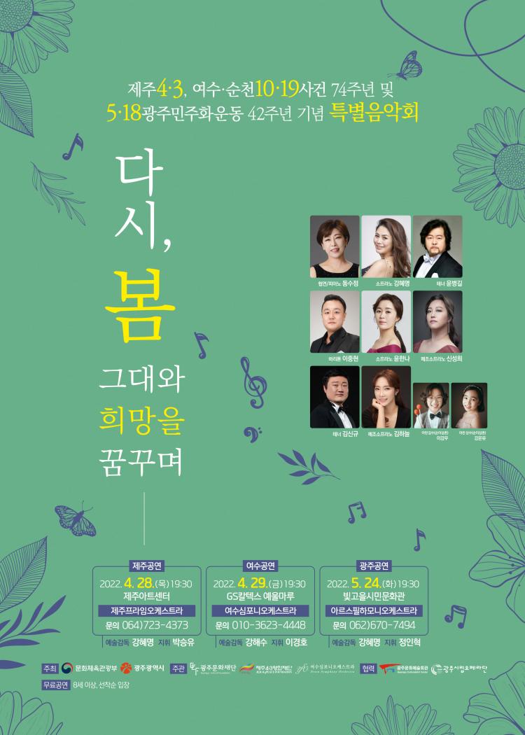 ¡®Á¦ÁÖ4¡¤3, ¿©¼ö¡¤¼øÃµ10¡¤19»ç°Ç 74ÁÖ³â ¹× 5¡¤18±¤ÁÖ¹ÎÁÖȿ 42Áֳ⠱â³ä Ưº°À½¾Çȸ¡¯°¡ ¡®´Ù½Ã, º½¡¦±×´ë¿Í Èñ¸ÁÀ» ²Þ²Ù¸ç¡¯¶ó´Â ÁÖÁ¦·Î ¿À´Â 24ÀÏ(È) Àú³á 7½Ã 30ºÐ, ºû°íÀ»½Ã¹Î¹®È°ü¿¡¼ ÆîÃÄÁø´Ù.
