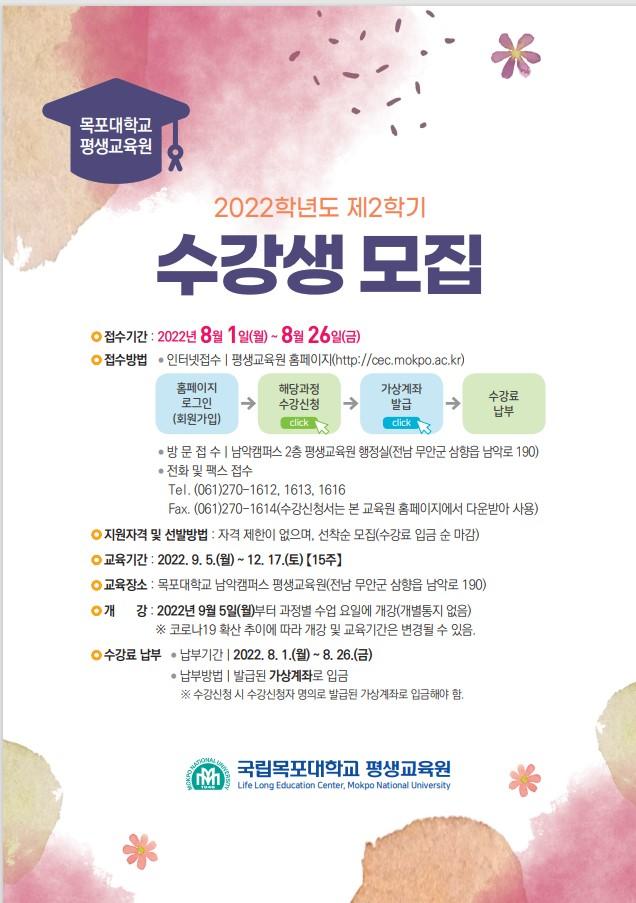 ±¹¸³¸ñÆ÷´ëÇб³(ÃÑÀå ¹Ú¹Î¼) Æò»ý±³À°¿ø(¿øÀå ¹éÁö¼÷)Àº 8¿ù 1ÀÏ(¿ù)ºÎÅÍ 26ÀÏ(±Ý)±îÁö 2022Çг⵵ 2ÇÐ±â Æò»ý±³À°¿ø ¼ö°»ýÀ» ¸ðÁýÇÑ´Ù°í ¹àÇû´Ù.