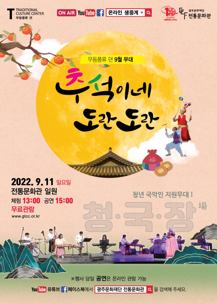 ¿Â °¡Á·ÀÌ º¸°í, ´À³¢°í, Áñ±æ ¼ö ÀÖ°Ô ²Ù¹Î À¶.º¹ÇÕ ÀüÅ빮ȿ¹¼ú ÇÁ·Î±×·¥ ¡®¹«µîdz·ù µ¯¡¯ 9¿ù ¹«´ë <Ãß¼®À̳×! µµ¶õµµ¶õ>À» ¿À´Â 11ÀÏ(ÀÏ) ¿ÀÈÄ 1½ÃºÎÅÍ ÀüÅ빮Ȱü ÀÏ¿ø¿¡¼ ¼±º¸ÀδÙ.