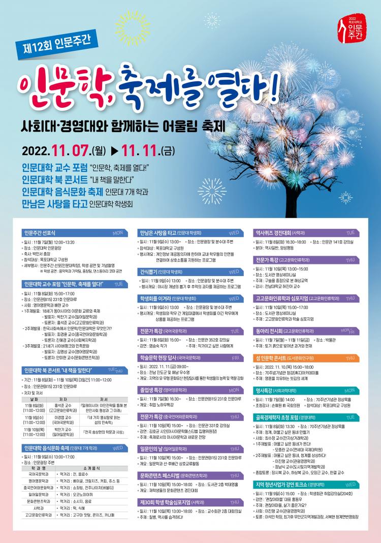±¹¸³¸ñÆ÷´ëÇб³(ÃÑÀå ¹Ú¹Î¼) Àι®´ëÇÐ(ÇÐÀå °¼®ÁÖ)Àº ¿À´Â 11¿ù 7ÀÏ(¿ù)ºÎÅÍ 11ÀÏ(±Ý)±îÁö¸¦ ¡®Á¦12ȸ Àι®ÁÖ°£¡¯À¸·Î ¼±Æ÷Çϰí Àι®Çаú °ü·ÃµÈ ¸í»ç ÃÊû Ư°, ºÏÄܼƮ, ±³¼ö Æ÷·³, Çлý Çмú ½ÉÆ÷Áö¾ö, Áö¿ª û³â»ç¾÷°¡ °¿¬ ÅäÅ©¼î, ¼¶ Àι®ÇÐ ÄܼƮ, À½½Ä¹®ÈÃàÁ¦ µî ´Ùä·Î¿î Çà»ç¸¦ °³ÃÖÇÑ´Ù°í ¹àÇû´Ù.