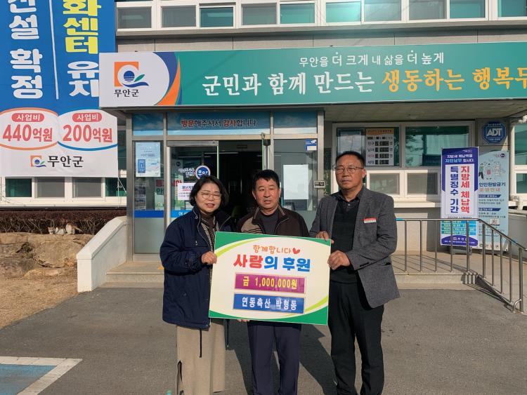¿¬µ¿Ãà»ê(´ëÇ¥ ¹ÚÇüµ¿)Àº ÃÖ±Ù ¹«¾È±º ¿î³²¸é»ç¹«¼Ò¸¦ ¹æ¹®ÇÏ¿© ÀÌ¿ôµ½±â ¼º±Ý 100¸¸¿øÀ» ±âŹÇÏ¸ç ¸±·¹ÀÌ ÈÄ¿ø ¹ÙÅëÀ» À̾î¹Þ¾Ò´Ù.