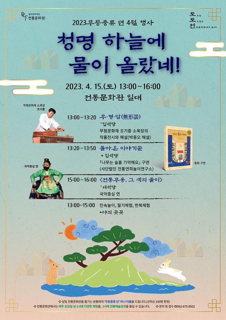 ¹«µîdz·ù µ¯ 4¿ù Çà»çÀÎ ¡®Ã»¸íÇϴÿ¡ ¹°ÀÌ ¿Ã¶ú³×¡¯´Â ÇÏ´ÃÀÌ ¸¼¾ÆÁö°í º½ºñ°¡ ³»·Á ¹é°îÀÌ ±â¸§Áö´Ù´Â Àý±â ¡®Ã»¸í¡¯°ú ¡®°î¿ì¡¯¸¦ ¸Â¾Æ ¾ÆÀ̵éÀ» À§ÇÑ ±¸¿¬µ¿È ¡®³ª¹«´Â ½£À» ±â¾ïÇØ¿ä¡¯, ÇØ¼³ÀÌ ÀÖ´Â ¹«Çü¹®ÈÀç ÀÛǰ Àü½Ã ¡®¹«¡¤Çü¡¤´ã(Ùíû¡ÓÈ)¡¯, ¿©¼¸ °¡Áö À帣ÀÇ ÀüÅ빫¿ëÀ» ÇÑÀÚ¸®¿¡¼ º¸´Â Åä¿ä»ó¼³°ø¿¬ ¡®ÀüÅ빫¿ë, ±× »öÀÇ Ç®ÀÌ¡¯¸¦ ¸¶·ÃÇß´Ù.