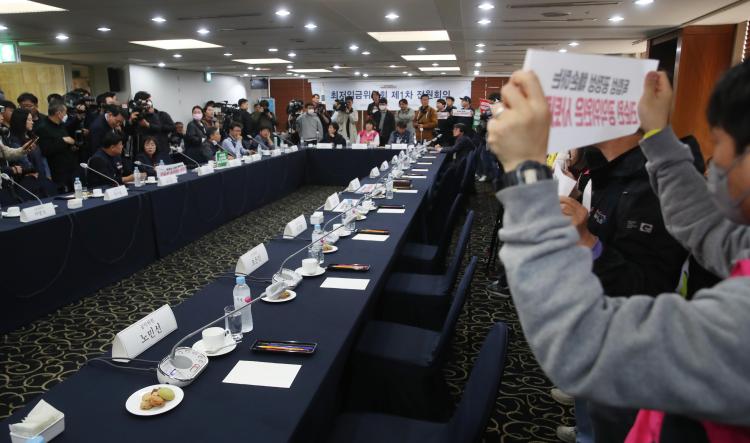 ³ëµ¿°è ±¸È£°¡ °è¼ÓµÇÀÚ ÃÖÀÓÀ§ °ü°èÀÚ´Â ¡°¿øÈ°ÇÑ È¸ÀÇ ÁøÇàÀ» À§ÇØ °ü°èÀÚ°¡ ¾Æ´Ñ ºÐµéÀº ÀÚ¸®¸¦ Á¤µ·ÇØ ´Þ¶ó¡±°í ¿äûÇß´Ù. ÇÏÁö¸¸ ¾ç´ë³ëÃÑ Á¶ÇÕ¿øµéÀº °Å¼¼°Ô Ç×ÀÇÇß°í, °øÀÍÀ§¿ø ºÒÂü ¼Ó¿¡ ȸÀÇ´Â 30ºÐ ³Ñ°Ô Áö¿¬µÆ´Ù.
