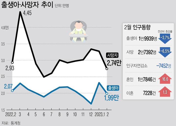 Åë°èûÀÌ 26ÀÏ ¹ßÇ¥ÇÑ ¡®2023³â 2¿ù Àα¸µ¿Ç⡯¿¡ µû¸£¸é Áö³ 2¿ù Ãâ»ý¾Æ ¼ö´Â 1¸¸9939¸íÀ¸·Î 1³â Àüº¸´Ù 3.7%(766¸í) °¨¼ÒÇß´Ù. Ãâ»ý¾Æ ¼ö´Â °èÀý µîÀÇ ¿µÇâÀ» ¹Þ±â ¶§¹®¿¡ Åë»ó °°Àº ´Þ³¢¸® ºñ±³ÇÑ´Ù.