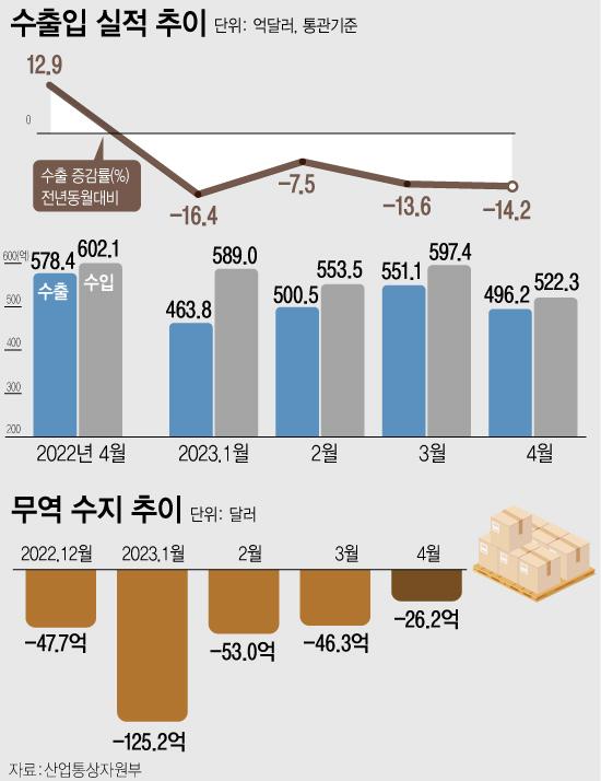 1ÀÏ »ê¾÷Åë»óÀÚ¿øºÎ°¡ ¹ßÇ¥ÇÑ ¡®2023³â 4¿ù ¼öÃâÀÔµ¿Ç⡯¿¡ µû¸£¸é 4¿ù ¼öÃâÀº Àü³âº¸´Ù 14.2% °¨¼ÒÇÑ 496¾ï2000¸¸ ´Þ·¯(66Á¶5404¾ï¿ø), ¼öÀÔÀº 13.3% °¨¼ÒÇÑ 522¾ï3000¸¸ ´Þ·¯(70Á¶404¾ï¿ø)·Î Áý°èµÆ´Ù. ÀÌ¿¡ µû¶ó ¹«¿ª¼öÁö´Â 26¾ï2000¸¸ ´Þ·¯ ÀûÀÚ¸¦ ½ÃÇöÇß´Ù.