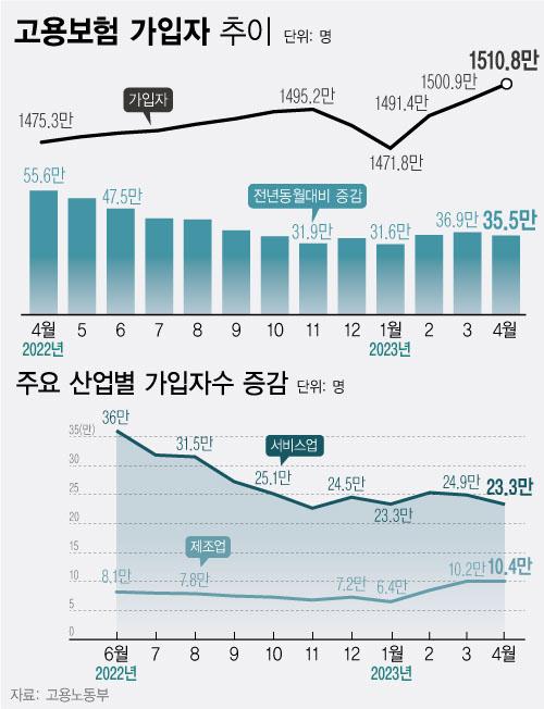 8ÀÏ °í¿ë³ëµ¿ºÎ°¡ ¹ßÇ¥ÇÑ ¡®°í¿ëÇàÁ¤ Åë°è·Î º» 2023³â 4¿ù ³ëµ¿½ÃÀå µ¿Ç⡯¿¡ µû¸£¸é 4¿ù ¸» ±âÁØ °í¿ëº¸Çè ½Å±Ô °¡ÀÔÀÚ´Â 1510¸¸8000¸íÀ̾ú´Ù. ÀÌ´Â Áö³ÇØ 4¿ù ´ëºñ 35¸¸5000¸í(2.4%) Áõ°¡ÇÑ ¼öÄ¡´Ù.