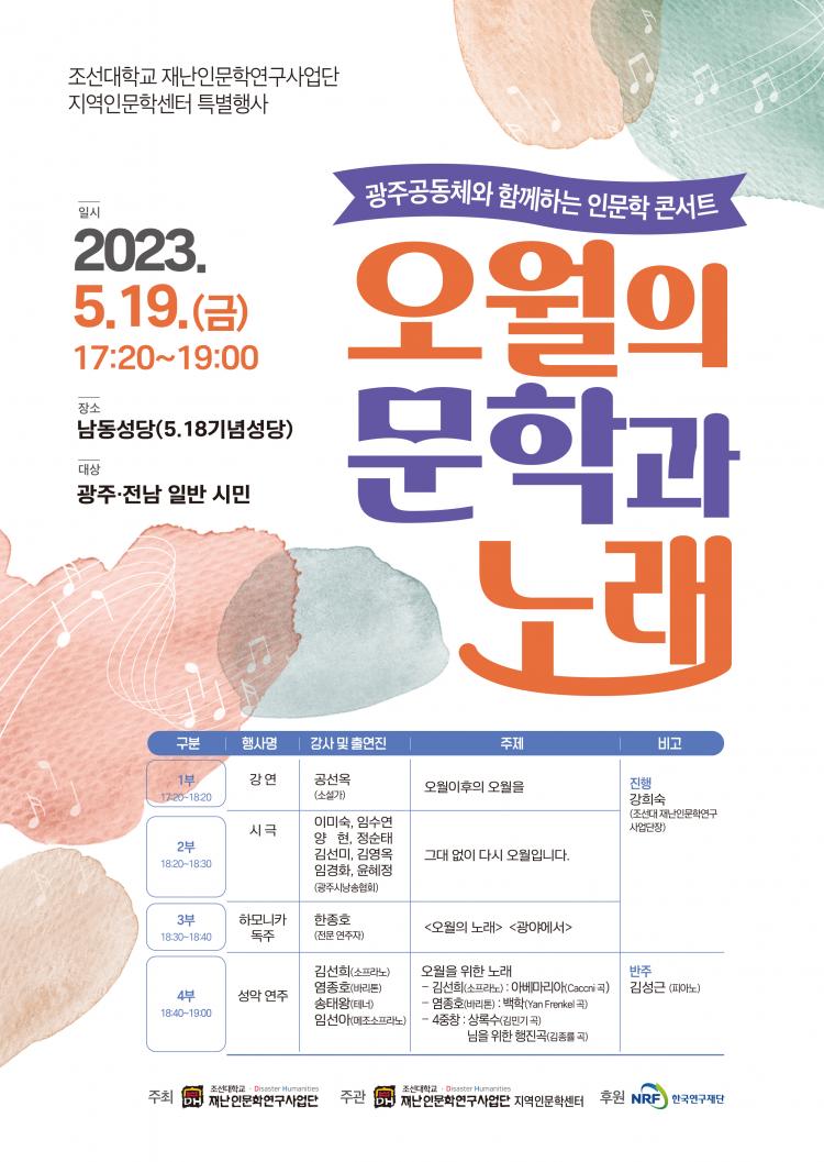 5¡¤18¹ÎÁÖȿ 43Áֱ⸦ ¹®ÇÐÀûÀ¸·Î Á¶¸íÇÏ´Â Àι®ÇÐ ÄܼƮ°¡ ±¤ÁÖ¿¡¼ ÆîÃÄÁø´Ù. Á¶¼±´ëÇб³ Àç³Àι®Çבּ¸»ç¾÷´ÜÀº 19ÀÏ ¿ÀÈÄ 5½Ã20ºÐ ³²µ¿¼º´ç¿¡¼ ¡®¿À¿ùÀÇ ¹®Çаú ³ë·¡¡¯¸¦ ÁÖÁ¦·Î Àι®ÇÐÄܼƮ°¡ ¿¸°´Ù°í 17ÀÏ ¹àÇû´Ù.