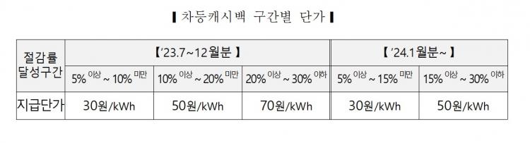 ´ÙÀ½´Þ¿¡ »ç¿ëÇÏ´Â Àü±â Àý°¨·®ºÎÅÍ ±âº»Ä³½Ã¹é°ú °ú°Å 2°³³â µ¿¿ù Æò±Õ ´ëºñ 5% ÀÌ»ó Àý°¨ÇÒ °æ¿ì, Àý°¨·ü 30%¸¦ Çѵµ·Î Àý°¨·ü ¼öÁØ¿¡ µû¶ó 1§Òh´ç 30~70¿ø Â÷µîij½Ã¹éÀ» Ãß°¡ Áö±ÞÇÑ´Ù. ´Ù¸¸ ¿À´Â 2024³âºÎÅÍ Àý°¨·ü ¼öÁØ¿¡ µû¶ó 1§Òh´ç 30~50¿øÀ¸·Î Á¶Á¤µÈ´Ù. ¿¡³ÊÁöij½Ã¹éÀº ±âÁ¸¿¡ Çö±Ý°ú ±âºÎ, Àü±â¿ä±ÝÂ÷°¨ Áß °í°´ÀÌ ¼±ÅÃÇÑ ¹æ½ÄÀ¸·Î ¹Ý±â ´ÜÀ§·Î Áö±ÞµÆ´Ù. ÇÏÁö¸¸ ´ÙÀ½´ÞºÎÅÍ´Â Àü±â¿ä±Ý¿¡¼ Â÷°¨ÇÏ´Â ¹æ½ÄÀ¸·Î º¯°æµÈ´Ù.