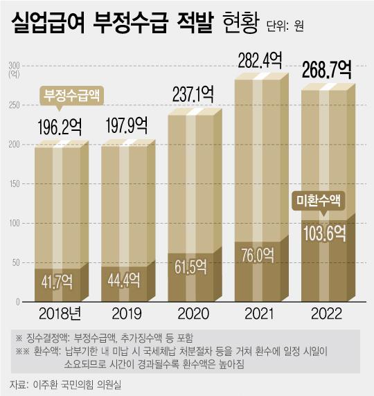 22ÀÏ ÀÌÁÖȯ ±¹¹ÎÀÇÈû ÀÇ¿ø½ÇÀÌ °í¿ë³ëµ¿ºÎ·ÎºÎÅÍ Á¦Ãâ¹ÞÀº ÀÚ·á¿¡ µû¸£¸é, 2022³â ½Ç¾÷±Þ¿© ºÎÁ¤¼ö±Þ¾×Àº 268¾ï7000¿©¸¸¿øÀ̰í ÀÌ Áß ¹Ìȯ¼ö¾×Àº 103¾ï6400¸¸¿ø°¡·®ÀÌ´Ù.