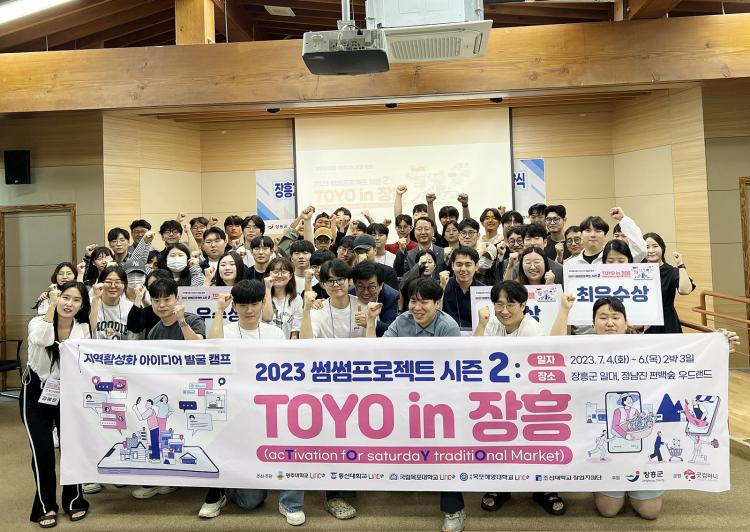 ¡®TOYO(acTivation fOr saturdaY traditiOnal market) in ÀåÈÀº ÀåÈï Åä¿ä½ÃÀå ¹× Áö¿ª ÀαÙÁö¿ª°ú ¿¬°áÇÑ Áö¿ª Ȱ¼ºÈ ¾ÆÀ̵ð¾î¸¦ ¹ß±¼ÇÏ´Â Ä·ÇÁ·Î 5°³ ´ëÇÐ(±¹¸³¸ñÆ÷´ë LINC 3.0 »ç¾÷´Ü, ¸ñÆ÷ÇØ¾ç´ë LINC 3.0 »ç¾÷´Ü, µ¿½Å´ë LINC 3.0 »ç¾÷´Ü, ±¤ÁÖ´ë LINC 3.0 »ç¾÷´Ü, Á¶¼±´ë â¾÷Áö¿ø´Ü) °ü±¤°æ¿µÇаú, ÇØ»ó¿î¼ÛÇкÎ, ÀÎÅ׸®¾îµðÀÚÀÎÇаú µî 22°³ Çаú 50¿©¸íÀÇ ÇлýµéÀÌ Âü¿©Çß´Ù.