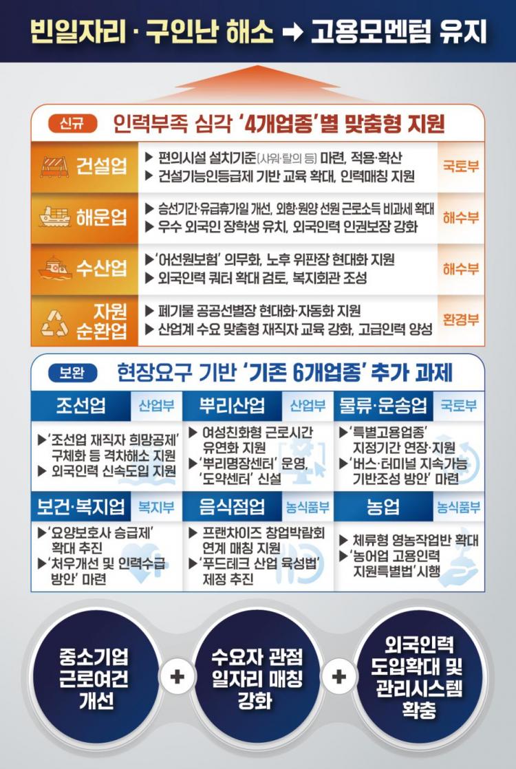 Á¤ºÎ°¡ Àη ºÎÁ·ÀÌ ½É°¢ÇÑ °Ç¼³¡¤Á¶¼± µî 10°³ ¾÷Á¾¿¡ ´ëÇØ ¸ÂÃãÇü Áö¿øÀ» °ÈÇÑ´Ù. ±¸Àγ ÇØ¼Ò¸¦ À§ÇØ ¿Ü±¹ Àηµµ 3¸¸¸í Ãß°¡ È®´ëÇÑ´Ù.