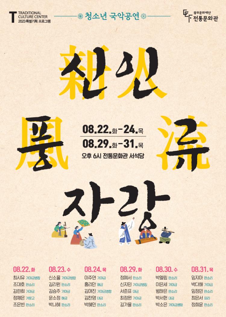 ±¤ÁÖ¹®ÈÀç´Ü(´ëÇ¥ÀÌ»ç Ȳdz³â) ÀüÅ빮ȰüÀº ¿À´Â 22ÀÏ(È)ºÎÅÍ 31ÀÏ(¸ñ)±îÁö ÃÑ 6ȸ¿¡ °ÉÃÄ Ã»¼Ò³â ¿¹ºñ ±¹¾Ç¸íÀεéÀÌ ÆîÄ¡´Â °ø¿¬¹«´ë ¡®½ÅÀÎdz·ùÀÚ¶û¡¯À» °³ÃÖÇÑ´Ù°í ¹àÇû´Ù.