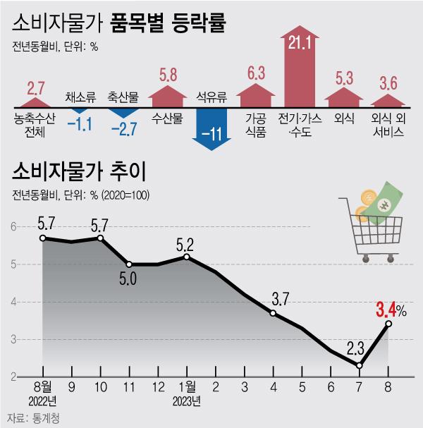 Åë°èûÀÌ 5ÀÏ ¹ßÇ¥ÇÑ ¡®8¿ù ¼ÒºñÀÚ¹°°¡ µ¿Ç⡯¿¡ µû¸£¸é Áö³´Þ ¼ÒºñÀÚ¹°°¡Áö¼ö´Â 112.33(2020=100)À¸·Î 1³â Àüº¸´Ù 3.4% ¿Ã¶ú´Ù. ÀÌ´Â Áö³ 4¿ù(3.7%) ÀÌÈÄ 4°³¿ù ¸¸¿¡ ÃÖ´ë »ó½ÂÆøÀÌ´Ù.