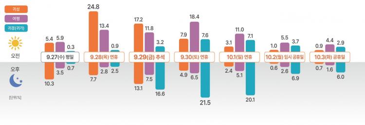 ±Í¼ºÀº Ãß¼® Àü³¯(28ÀÏ) ¿ÀÀü(10~11½Ã)¸¦ °¡Àå ¼±È£, ±Í°æÀº Ãß¼® ´ÙÀ½ ³¯(30ÀÏ) ¿ÀÈÄ(2~3½Ã)¿Í 1ÀÏ ¿ÀÈÄ(3~4½Ã)¸¦ °¡Àå ¼±È£ÇÏ´Â °ÍÀ¸·Î Á¶»çµÆ´Ù. ¿¬ÈޱⰣ Áß ±Í¼º, ¿©Çà, ±Í°æ Ãâ¹ßÀÏÀÌ ÁýÁߵǴ 29Àϰú 30ÀÏÀÇ ±³ÅëÈ¥ÀâÀÌ ½ÉÇÒ °ÍÀ¸·Î ¿¹»óµÈ´Ù.