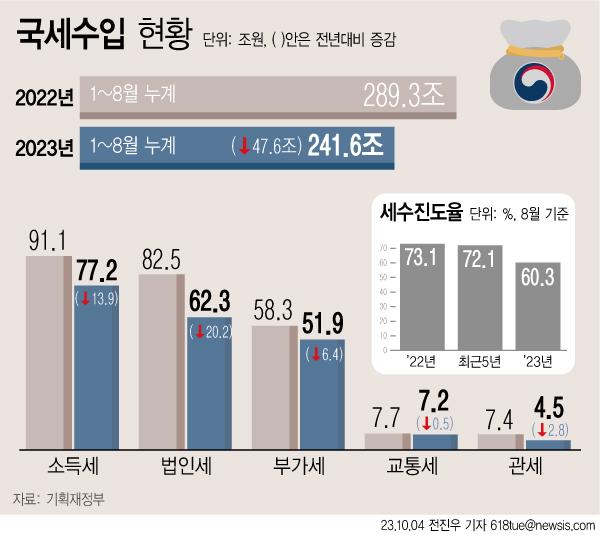 ¿ÃÇØ 8¿ù±îÁö ±¹¼¼¼öÀÔÀÌ Áö³ÇØ °°Àº ±â°£º¸´Ù 47Á¶¿ø ³Ñ°Ô ´ú °ÈÈù °ÍÀ¸·Î ³ªÅ¸³µ´Ù. ¼¼¼ö ½ÇÀû ºÎÁøÀÌ À̾îÁö¸é¼ Á¤ºÎ°¡ ¿¹»óÇÑ »ç»ó ÃÖ´ë ±Ô¸ðÀÎ 60Á¶¿ø ¼¼¼ö °á¼ÕÀÌ Çö½ÇÈÇÏ´Â ºÐÀ§±â´Ù.