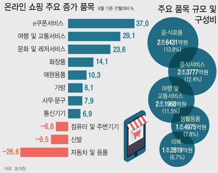 ¼Ò¸ÅÆÇ¸Å¾× Áß ¿©Çࡤ±³Å뼺ñ½º, ¹®È¡¤·¹Àú¼ºñ½º, ÀÌÄíÆù¼ºñ½º, À½½Ä¼ºñ½º, ±âŸ¼ºñ½º °Å·¡¾×À» Á¦¿ÜÇÑ ¿Â¶óÀμîÇÎ »óǰ °Å·¡¾×(13Á¶2040¾ï¿ø)ÀÌ Àüü ¼Ò¸ÅÆÇ¸Å¾×(51Á¶4959¾ï¿ø)¿¡¼ Â÷ÁöÇÑ ºñÁßÀº 25.6%·Î Áý°èµÆ´Ù.